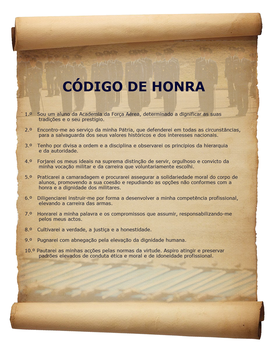 O Código de Honra do Aluno da Academia da Força Aérea (AFA) constitui, mais do que um conjunto de regras, a base que define quem és enquanto aluno da Academia, e quem te estás a tornar enquanto oficial.